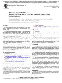 ASTM C174/C174M-17 is a standard published by ASTM International. Its full title is "Standard Test Method for Measuring Thickness of Concrete Elements Using Drilled Concrete Cores". This standard covers: SIGNIFICANCE AND USE 4.1 This test method is used to determine the compliance of concrete construction with design specifications and is commonly used in determining the thickness of pavements and other slab construction. This test method requires that at least one end of the core be a finished or formed surface. SCOPE 1.1 This test method covers the determination of the thickness of a concrete pavement, slab, or structural element using drilling cores. 1.2 The values stated in either SI units or inch-pound units are to be regarded separately as standard. Within the text, the inch-pound units are shown in brackets. The values stated in each system are not exact equivalents; therefore, each system shall be used independently of the other. 1.3 This standard does not purport to address all of the safety concerns, if any, associated with its use. It is the responsibility of the user of this standard to establish appropriate safety and health practices and determine the applicability of regulatory limitations prior to use. 1.4 This international standard was developed in accordance with internationally recognized principles on standardization established in the Decision on Principles for the Development of International Standards, Guides and Recommendations issued by the World Trade Organization Technical Barriers to Trade (TBT) Committee.
