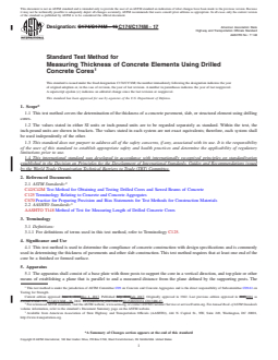 SIGNIFICANCE AND USE 4.1 This test method is used to determine the compliance of concrete construction with design specifications and is commonly used in determining the thickness of pavements and other slab construction. This test method requires that at least one end of the core be a finished or formed surface. SCOPE 1.1 This test method covers the determination of the thickness of a concrete pavement, slab, or structural element using drilling cores. 1.2 The values stated in either SI units or inch-pound units are to be regarded separately as standard. Within the text, the inch-pound units are shown in brackets. The values stated in each system are not exact equivalents; therefore, each system shall be used independently of the other. 1.3 This standard does not purport to address all of the safety concerns, if any, associated with its use. It is the responsibility of the user of this standard to establish appropriate safety and health practices and determine the applicability of regulatory limitations prior to use. 1.4 This international standard was developed in accordance with internationally recognized principles on standardization established in the Decision on Principles for the Development of International Standards, Guides and Recommendations issued by the World Trade Organization Technical Barriers to Trade (TBT) Committee.
