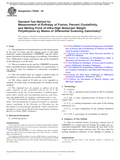 ASTM F2625-24 is a standard published by ASTM International. Its full title is "Standard Test Method for Measurement of Enthalpy of Fusion, Percent Crystallinity, and Melting Point of Ultra-High Molecular Weight Polyethylene by Means of Differential Scanning Calorimetry". This standard covers: SIGNIFICANCE AND USE 5.1 The crystallinity of UHMWPE will influence its mechanical properties, such as creep and stiffness. The reported crystallinity will depend on the integration range used to determine the heat of fusion, and the theoretical heat of fusion of 100 % crystalline polyethylene used to calculate the percent crystallinity in an unknown specimen. Differential scanning calorimetry is an effective means of accurately measuring both heat of fusion and melting temperature. 5.2 This test method is useful for both process control and research. SCOPE 1.1 This quantitative test method discusses the measurement of the heat of fusion and the melting point of ultra-high molecular weight polyethylene (UHMWPE), and the subsequent calculation of the percentage of crystallinity. The method uses a differential scanning calorimeter and can be performed in the laboratory or in the field. 1.2 This test method can be used for UHMWPE in powder form, consolidated form, finished product, or a used product. It can also be used for irradiated or chemically crosslinked UHMWPE. 1.3 This test method does not suggest a desired range of crystallinity or melting points for specific applications. 1.4 The values stated in SI units are to be regarded as standard. No other units of measurement are included in this standard. 1.5 This standard does not purport to address all of the safety concerns, if any, associated with its use. It is the responsibility of the user of this standard to establish appropriate safety, health, and environmental practices and determine the applicability of regulatory limitations prior to use. 1.6 This international standard was developed in accordance with internationally recognized principles on standardization established in the Decision on Principles for the Development of International Standards, Guides and Recommendations issued by the World Trade Organization Technical Barriers to Trade (TBT) Committee.