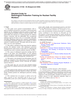 ASTM E1168-95(2020): Standard Guide for Radiological Protection Training for Nuclear Facility Workers provides a comprehensive framework for developing effective radiological protection training programs at nuclear facilities. Emphasizing the importance of minimizing occupational radiation exposure (consistent with the "as low as is reasonably achievable" or ALARA philosophy), this standard outlines essential elements for both initial and refresher training. Its standardized approach assures both employers and workers that training meets regulatory requirements, keeps workers safe in radiologically controlled areas, and prevents unnecessary retraining.