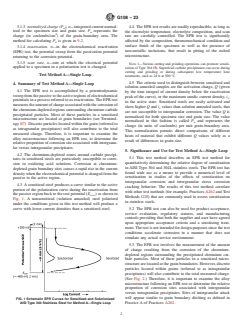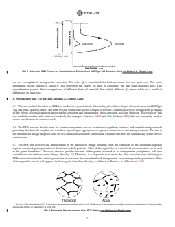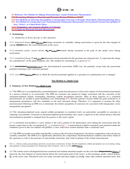 SIGNIFICANCE AND USE 5.1 This test method describes an EPR test method for quantitatively determining the relative degree of sensitization in AISI Type 304 and 304L stainless steels. The EPR test has found wide use as a means to provide a numerical level of sensitization in studies of the effects of sensitization on intergranular corrosion and intergranular stress corrosion cracking behavior. The results of this test method correlate with other test methods (for example, Practices A262 and Test Methods G28) that are commonly used to assess sensitization in stainless steels. 5.2 The EPR test can also be used for product acceptance, service evaluation, regulatory statutes, and manufacturing controls providing that both the supplier and user have agreed upon appropriate acceptance criteria and a sensitizing treatment. The test is not intended for design purposes since the test conditions accelerate corrosion in a manner that does not simulate any actual service environment. 5.3 The EPR test involves the measurement of the amount of charge resulting from the corrosion of the chromium-depleted regions surrounding the precipitated chromium carbide particles. Most of these particles in a sensitized microstructure are located at the grain boundaries. However, discrete particles located within grains (referred to as intragranular precipitates) will also contribute to the total measured charge. (See Fig. 2.) Therefore, it is important to examine the alloy microstructure following an EPR test to determine the relative proportion of corrosion sites associated with intergranular versus intragranular precipitates. Sites of intergranular attack will appear similar to grain boundary ditching as defined in Practice A of Practices A262. FIG. 2 Schematic Microstructures After EPR Testing for Method A—Single Loop Note 1: The calculation of Pa is based on the assumptions illustrated at left. Mild cases of sensitization usually result in a combination of intergranular attack and pitting as illustr... SCOPE 1.1 These test methods cover a laboratory procedure for conducting an electrochemical reactivation (EPR) test on AISI Type 304 and 304L (UNS No. S30400 and S30403, respectively) stainless steels. These test methods can provide a nondestructive means of quantifying the degree of sensitization in Type 304 stainless steels (1, 2, 3).2 These EPR test methods have found wide acceptance in studies of the effects of sensitization on intergranular corrosion and intergranular stress corrosion cracking behavior (see Terminology G193). The EPR technique has been successfully used to evaluate other stainless steels and nickel base alloys (4), but the test conditions and evaluation criteria used were modified in each case from those cited in the current test methods. This standard test covers two tests, (1) Test Method A or Single Loop, and (2) Test Method B or Double Loop. 1.2 The values stated in SI units are to be regarded as standard. The values given in parentheses after SI units are provided for information only and are not considered standard. 1.3 This standard does not purport to address all of the safety concerns, if any, associated with its use. It is the responsibility of the user of this standard to establish appropriate safety, health, and environmental practices and determine the applicability of regulatory limitations prior to use. 1.4 This international standard was developed in accordance with internationally recognized principles on standardization established in the Decision on Principles for the Development of International Standards, Guides and Recommendations issued by the World Trade Organization Technical Barriers to Trade (TBT) Committee.
