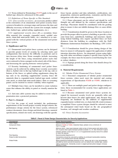 SIGNIFICANCE AND USE 4.1 Ornamental steel picket fence systems can be designed to provide greater levels of security by selecting styles and configurations that increase the difficulty to penetrate and in turn increase delay time. Some examples include: increasing the height of the fence, using ornamental picket styles that curve outward to form a parapet on the attack side of the fence, and decreasing the spacing between vertical pickets. 4.2 Security hardening of ornamental steel picket fence systems can be achieved by adding fence security accessories (that is, barbed wire to the top; barbed tape to the top, side or bottom of the fence; or spiked railing supplements along the top rail) or by attaching supplemental security fence fill materials (that is, expanded metal, barbed tape mesh, welded wire mesh, or chain-link mini-mesh fabric). Slats or screening panels can be inserted to restrict visibility when required. 4.3 Multiple fence lines can be installed to create isolation zones that enhance the ability to patrol or visually monitor the area. 4.4 Anti-ram cable systems may be added to resist vehicle penetration into a protected perimeter. SCOPE 1.1 This guide covers the material and installation standards for selection in the design of an ornamental steel picket fence system for security applications. The proper material selection and system installation and layout can substantially increase the difficulty to penetrate; thereby, increasing the intrusion delay time. 1.2 This standard does not purport to address all of the safety concerns, if any, associated with its use. It is the responsibility of the user of this standard to establish appropriate safety, health, and environmental practices and determine the applicability of regulatory limitations prior to use. 1.3 This guide is not intended to set specific requirements for an ornamental steel picket fence system for security purposes. It intends to cover the considerations or options pertinent to the design and construction of ornamental steel picket fence systems for security purposes. 1.4 This international standard was developed in accordance with internationally recognized principles on standardization established in the Decision on Principles for the Development of International Standards, Guides and Recommendations issued by the World Trade Organization Technical Barriers to Trade (TBT) Committee.