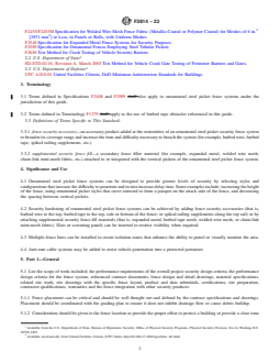 ASTM F2814-23 is a guide published by ASTM International. Its full title is "Standard Guide for Design and Construction of Ornamental Steel Picket Fence Systems for Security Purposes". This standard covers: SIGNIFICANCE AND USE 4.1 Ornamental steel picket fence systems can be designed to provide greater levels of security by selecting styles and configurations that increase the difficulty to penetrate and in turn increase delay time. Some examples include: increasing the height of the fence, using ornamental picket styles that curve outward to form a parapet on the attack side of the fence, and decreasing the spacing between vertical pickets. 4.2 Security hardening of ornamental steel picket fence systems can be achieved by adding fence security accessories (that is, barbed wire to the top; barbed tape to the top, side or bottom of the fence; or spiked railing supplements along the top rail) or by attaching supplemental security fence fill materials (that is, expanded metal, barbed tape mesh, welded wire mesh, or chain-link mini-mesh fabric). Slats or screening panels can be inserted to restrict visibility when required. 4.3 Multiple fence lines can be installed to create isolation zones that enhance the ability to patrol or visually monitor the area. 4.4 Anti-ram cable systems may be added to resist vehicle penetration into a protected perimeter. SCOPE 1.1 This guide covers the material and installation standards for selection in the design of an ornamental steel picket fence system for security applications. The proper material selection and system installation and layout can substantially increase the difficulty to penetrate; thereby, increasing the intrusion delay time. 1.2 This standard does not purport to address all of the safety concerns, if any, associated with its use. It is the responsibility of the user of this standard to establish appropriate safety, health, and environmental practices and determine the applicability of regulatory limitations prior to use. 1.3 This guide is not intended to set specific requirements for an ornamental steel picket fence system for security purposes. It intends to cover the considerations or options pertinent to the design and construction of ornamental steel picket fence systems for security purposes. 1.4 This international standard was developed in accordance with internationally recognized principles on standardization established in the Decision on Principles for the Development of International Standards, Guides and Recommendations issued by the World Trade Organization Technical Barriers to Trade (TBT) Committee.