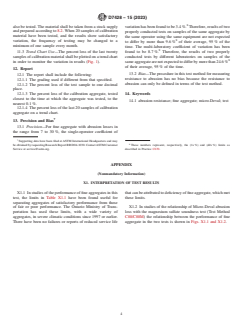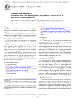 SIGNIFICANCE AND USE 5.1 The Micro-Deval abrasion test is a test of fine aggregate to determine abrasion loss in the presence of water and an abrasive charge. Many aggregates are more susceptible to abrasion when wet than dry, and the use of water in this test incorporates this reduction in resistance to degradation. The test results are helpful in evaluating the toughness/abrasion resistance of fine aggregate subject to abrasion when adequate information is not available from service records. This test is suitable for measuring the amount of weak, soft material such as shale or shaley carbonate in fine aggregate. Materials that give a low loss in this test are unlikely to exhibit significant degradation during handling, mixing, or placing. There is a relationship between drying shrinkage of cement mortar and Micro-Deval abrasion loss of fine aggregate, with higher loss materials resulting in higher drying shrinkage. Descriptions of the development of the test and the relationship with other properties have been published.3,4,5 5.2 The Micro-Deval abrasion test on fine aggregate is useful for detecting changes in properties of aggregate produced from an aggregate source as part of a quality control or quality assurance process. 5.3 The Micro-Deval abrasion test on fine aggregate, in contrast to the version on coarse aggregate, has a significant correlation with the magnesium sulfate soundness loss of fine aggregate. The Micro-Deval test on fine aggregate has better precision than the sulfate soundness test, is quicker, and may be used in place of that test. Advice on specific values for selection of aggregate will be found in the appendix. SCOPE 1.1 This test method covers a procedure for testing fine aggregate for resistance to abrasion using the Micro-Deval apparatus. 1.2 The text of this method references notes and footnotes which provide explanatory material. These notes and footnotes (excluding those in tables and figures) shall not be considered as requirements of the test method. 1.3 The values stated in SI units are to be regarded as standard. No other units of measurement are included in this standard. 1.4 This standard does not purport to address all of the safety concerns, if any, associated with its use. It is the responsibility of the user of this standard to establish appropriate safety, health, and environmental practices and determine the applicability of regulatory limitations prior to use. 1.5 This international standard was developed in accordance with internationally recognized principles on standardization established in the Decision on Principles for the Development of International Standards, Guides and Recommendations issued by the World Trade Organization Technical Barriers to Trade (TBT) Committee.
