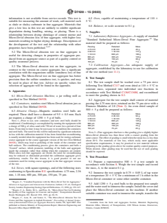 ASTM D7428-15(2023) is a standard published by ASTM International. Its full title is "Standard Test Method for Resistance of Fine Aggregate to Degradation by Abrasion in the Micro-Deval Apparatus". This standard covers: SIGNIFICANCE AND USE 5.1 The Micro-Deval abrasion test is a test of fine aggregate to determine abrasion loss in the presence of water and an abrasive charge. Many aggregates are more susceptible to abrasion when wet than dry, and the use of water in this test incorporates this reduction in resistance to degradation. The test results are helpful in evaluating the toughness/abrasion resistance of fine aggregate subject to abrasion when adequate information is not available from service records. This test is suitable for measuring the amount of weak, soft material such as shale or shaley carbonate in fine aggregate. Materials that give a low loss in this test are unlikely to exhibit significant degradation during handling, mixing, or placing. There is a relationship between drying shrinkage of cement mortar and Micro-Deval abrasion loss of fine aggregate, with higher loss materials resulting in higher drying shrinkage. Descriptions of the development of the test and the relationship with other properties have been published.3,4,5 5.2 The Micro-Deval abrasion test on fine aggregate is useful for detecting changes in properties of aggregate produced from an aggregate source as part of a quality control or quality assurance process. 5.3 The Micro-Deval abrasion test on fine aggregate, in contrast to the version on coarse aggregate, has a significant correlation with the magnesium sulfate soundness loss of fine aggregate. The Micro-Deval test on fine aggregate has better precision than the sulfate soundness test, is quicker, and may be used in place of that test. Advice on specific values for selection of aggregate will be found in the appendix. SCOPE 1.1 This test method covers a procedure for testing fine aggregate for resistance to abrasion using the Micro-Deval apparatus. 1.2 The text of this method references notes and footnotes which provide explanatory material. These notes and footnotes (excluding those in tables and figures) shall not be considered as requirements of the test method. 1.3 The values stated in SI units are to be regarded as standard. No other units of measurement are included in this standard. 1.4 This standard does not purport to address all of the safety concerns, if any, associated with its use. It is the responsibility of the user of this standard to establish appropriate safety, health, and environmental practices and determine the applicability of regulatory limitations prior to use. 1.5 This international standard was developed in accordance with internationally recognized principles on standardization established in the Decision on Principles for the Development of International Standards, Guides and Recommendations issued by the World Trade Organization Technical Barriers to Trade (TBT) Committee.