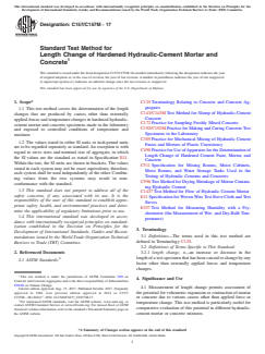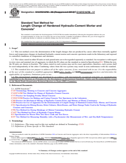 SIGNIFICANCE AND USE 4.1 Measurement of length change permits assessment of the potential for volumetric expansion or contraction of mortar or concrete due to various causes other than applied force or temperature change. This test method is particularly useful for comparative evaluation of this potential in different hydraulic-cement mortar or concrete mixtures. 4.2 This test method provides useful information for experimental purposes or for products that require testing under nonstandard mixing, placing, handling, or curing conditions, such as high product workability or different demolding times. Standard conditions are described in 5.4.1. 4.3 If conditions for mixing, curing, sampling, and storage other than specified in this test method are required, they shall be reported but are not to be considered as standard conditions of this test method. Nonstandard conditions and the reasons for departure from standard conditions shall be reported clearly and prominently with comparator values. SCOPE 1.1 This test method covers the determination of the length changes that are produced by causes other than externally applied forces and temperature changes in hardened hydraulic-cement mortar and concrete specimens made in the laboratory and exposed to controlled conditions of temperature and moisture. 1.2 The values stated in either SI units or inch-pound units are to be regarded separately as standard. An exception is with regard to sieve sizes and nominal size of aggregate, in which the SI values are the standard as stated in Specification E11. Within the text, the SI units are shown in brackets. The values stated in each system may not be exact equivalents; therefore, each system shall be used independently of the other. Combining values from the two systems may result in non-conformance with the standard. 1.3 This standard does not purport to address all of the safety concerns, if any, associated with its use. It is the responsibility of the user of this standard to establish appropriate safety, health, and environmental practices and determine the applicability of regulatory limitations prior to use. 1.4 This international standard was developed in accordance with internationally recognized principles on standardization established in the Decision on Principles for the Development of International Standards, Guides and Recommendations issued by the World Trade Organization Technical Barriers to Trade (TBT) Committee.