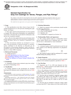 ASTM A126-04(2023) is a technical specification published by ASTM International. Its full title is "Standard Specification for Gray Iron Castings for Valves, Flanges, and Pipe Fittings". This standard covers: ABSTRACT This guide covers standard specification for three classes of gray iron for castings intended for use as valve pressure retaining parts, pipe fittings, and flanges. Chemical analysis shall be performed in each lot and shall conform to the required chemical composition for phosphorous and sulfur. Tension test shall be conducted on each class of gray iron castings and shall conform to the specified values of tensile strength. Tension test specimens shall have threaded ends and shall conform to the prescribed dimensions. SCOPE 1.1 This specification covers three classes of gray iron for castings intended for use as valve pressure-retaining parts, pipe fittings, and flanges. 1.2 The values stated in inch-pound units are to be regarded as standard. The values given in parentheses are mathematical conversions to SI units that are provided for information only and are not considered standard. Note 1: The text of this standard references notes and footnotes which provide explanatory material. These notes and footnotes (excluding those in tables and figures) shall not be considered as requirements of the standard. 1.3 This international standard was developed in accordance with internationally recognized principles on standardization established in the Decision on Principles for the Development of International Standards, Guides and Recommendations issued by the World Trade Organization Technical Barriers to Trade (TBT) Committee.