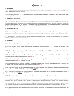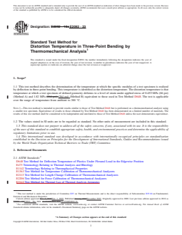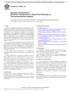 SIGNIFICANCE AND USE 5.1 Data obtained by this test method shall not be used to predict the behavior of materials at elevated temperatures except in applications in which the conditions of time, temperature, method of loading, and stress are similar to those specified in the test. 5.2 This standard is particularly suited for quality control and development work. The data are not intended for use in design or predicting endurance at elevated temperatures. SCOPE 1.1 This test method describes the determination of the temperature at which the specific modulus of a test specimen is realized by deflection in three-point bending. This temperature is identified as the distortion temperature. The distortion temperature is that temperature at which a test specimen of defined geometry deforms to a level of strain under applied stress of 0.455 MPa (66 psi) (Method A) and 1.82 MPa (264 psi) (Method B) equivalent to those used in Test Method D648. The test is applicable over the range of temperature from ambient to 300 °C. Note 1: This test method is intended to provide results similar to those of Test Method D648 but is performed on a thermomechanical analyzer using a smaller test specimen. Equivalence of results to those obtained by Test Method D648 has been demonstrated on a limited number of materials. The results of this test method shall be considered to be independent and unrelated to those of Test Method D648 unless the user demonstrates equivalence. 1.2 The values stated in SI units are to be regarded as standard. No other units of measurement are included in this standard. 1.3 This standard does not purport to address all of the safety concerns, if any, associated with its use. It is the responsibility of the user of this standard to establish appropriate safety, health, and environmental practices and determine the applicability of regulatory limitations prior to use. 1.4 This international standard was developed in accordance with internationally recognized principles on standardization established in the Decision on Principles for the Development of International Standards, Guides and Recommendations issued by the World Trade Organization Technical Barriers to Trade (TBT) Committee.