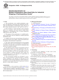 ASTM D4504-94(2018) is a technical specification published by ASTM International. Its full title is "Standard Specification for Molded Polyethylene Open-Head-Pails for Industrial Shipping of Nonhazardous Goods". This standard covers: ABSTRACT This specification establishes the performance requirements and test methods for molded polyethylene open-head, self-supporting, and nonreusable pails used in packaging and transporting nonhazardous goods. The products for packaging in the open-head pails may be in liquid, solid, past, granular, or powder form. Each pail is classified as either pails for liquids or pails for nonliquids. Materials for the manufacture of the pails should be compatible with the intended contents. Carbon black or other suitable pigments may be used for ultraviolet protection if needed. Each pail should conform to the required values of capacity, closure, drop strength, stacking strength, amount of column stack vibratioin, compatibility permeation, resistance to environmental stress cracking, and other special requirements. SCOPE 1.1 This specification covers molded polyethylene, open-head, self-supporting, nonreusable pails intended for the packaging and transportation of nonhazardous goods. Pails are to have volume capacities between 1 and 7 gal (3.8 to 26.5 L). 1.2 Pails intended to contain hazardous goods (materials) shall be in accordance with and tested to United States Department of Transportation Code of Federal Regulations (CFR) Title 49, Parts (100–199). 1.3 The purpose of this specification is to establish performance requirements and test methods for molded open-head polyethylene pails. 1.4 Additives for the resin used and design of the pails are left to the discretion of the supplier, within the allowable limits of regulatory and performance requirements. 1.5 The values stated in inch-pound units are to be regarded as standard. The values given in parentheses are mathematical conversions to SI units that are provided for information only and are not considered standard. 1.6 The following safety hazards caveat pertains to the test method portions, Section 10, of this specification: This standard does not purport to address all of the safety concerns, if any, associated with its use. It is the responsibility of the user of this standard to establish appropriate safety, health, and environmental practices and determine the applicability of regulatory limitations prior to use. 1.7 This international standard was developed in accordance with internationally recognized principles on standardization established in the Decision on Principles for the Development of International Standards, Guides and Recommendations issued by the World Trade Organization Technical Barriers to Trade (TBT) Committee.