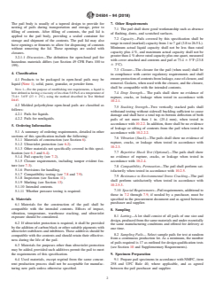 ABSTRACT This specification establishes the performance requirements and test methods for molded polyethylene open-head, self-supporting, and nonreusable pails used in packaging and transporting nonhazardous goods. The products for packaging in the open-head pails may be in liquid, solid, past, granular, or powder form. Each pail is classified as either pails for liquids or pails for nonliquids. Materials for the manufacture of the pails should be compatible with the intended contents. Carbon black or other suitable pigments may be used for ultraviolet protection if needed. Each pail should conform to the required values of capacity, closure, drop strength, stacking strength, amount of column stack vibratioin, compatibility permeation, resistance to environmental stress cracking, and other special requirements. SCOPE 1.1 This specification covers molded polyethylene, open-head, self-supporting, nonreusable pails intended for the packaging and transportation of nonhazardous goods. Pails are to have volume capacities between 1 and 7 gal (3.8 to 26.5 L). 1.2 Pails intended to contain hazardous goods (materials) shall be in accordance with and tested to United States Department of Transportation Code of Federal Regulations (CFR) Title 49, Parts (100–199). 1.3 The purpose of this specification is to establish performance requirements and test methods for molded open-head polyethylene pails. 1.4 Additives for the resin used and design of the pails are left to the discretion of the supplier, within the allowable limits of regulatory and performance requirements. 1.5 The values stated in inch-pound units are to be regarded as standard. The values given in parentheses are mathematical conversions to SI units that are provided for information only and are not considered standard. 1.6 The following safety hazards caveat pertains to the test method portions, Section 10, of this specification: This standard does not purport to address all of the safety concerns, if any, associated with its use. It is the responsibility of the user of this standard to establish appropriate safety, health, and environmental practices and determine the applicability of regulatory limitations prior to use. 1.7 This international standard was developed in accordance with internationally recognized principles on standardization established in the Decision on Principles for the Development of International Standards, Guides and Recommendations issued by the World Trade Organization Technical Barriers to Trade (TBT) Committee.