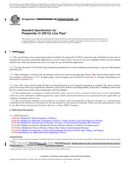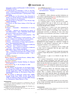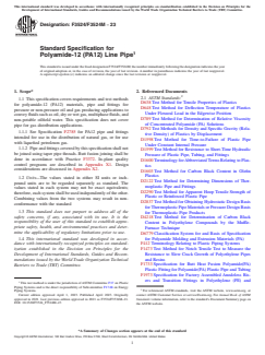 SCOPE 1.1 This specification covers requirements and test methods for polyamide-12 (PA12) materials, pipe and fittings for pressure or non-pressure oil and gas producing applications to convey fluids such as oil, dry or wet gas, multiphase fluids, and non-potable oilfield water. This specification does not cover pipe for gas distribution applications. 1.1.1 See Specification F2785 for PA12 pipe and fittings intended for use in the distribution of natural gas, or for use with liquefied petroleum gas. 1.1.2 Pipe and fittings covered by this specification shall not be joined using taper pipe threads. Butt fusion joining shall be done in accordance with Practice F3372. In-plant quality control programs are described in Appendix X1. Design considerations are discussed in Appendix X2. 1.2 Units—The values stated in either SI units or inch-pound units are to be regarded separately as standard. The values stated in each system may not be exact equivalents; therefore, each system shall be used independently of the other. Combining values from the two systems may result in non-conformance with the standard 1.3 This standard does not purport to address all of the safety concerns, if any, associated with its use. It is the responsibility of the user of this standard to establish appropriate safety, health, and environmental practices and determine the applicability of regulatory limitations prior to use. 1.4 This international standard was developed in accordance with internationally recognized principles on standardization established in the Decision on Principles for the Development of International Standards, Guides and Recommendations issued by the World Trade Organization Technical Barriers to Trade (TBT) Committee.