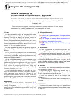 ASTM E920-97(2019) is a technical specification published by ASTM International. Its full title is "Standard Specification for Commercially Packaged Laboratory Apparatus". This standard covers: ABSTRACT This specification covers the procedures for testing loaded shipping containers. Drop and vibration tests are performed to measure the ability of the shipping container to protect the product from the shock and vibration the container receives during normal handling and transporting. This specification is not intended for use with hazardous materials. The procedures are suitable for all types of laboratory apparatus, including reusable and disposable macro and micro products. SCOPE 1.1 This specification covers the procedures for testing loaded shipping containers. Drop and vibration tests are performed to measure the ability of the shipping container to protect the product from the shock and vibration the container receives during normal handling and transporting. This specification is not intended to supplant material specifications or existing preshipment test procedures. This specification is not intended for use with hazardous materials. 1.2 These procedures are suitable for all types of laboratory apparatus, including reusable and disposable macro and micro products. 1.3 The values stated in inch-pound units are to be regarded as standard. The values given in parentheses are mathematical conversions to SI units that are provided for information only and are not considered standard. 1.4 The following precautionary caveat pertains only to the test method portion, Section 4, of this specification: This standard does not purport to address all of the safety concerns, if any, associated with its use. It is the responsibility of the user of this standard to establish appropriate safety, health, and environmental practices and determine the applicability of regulatory limitations prior to use. 1.5 This international standard was developed in accordance with internationally recognized principles on standardization established in the Decision on Principles for the Development of International Standards, Guides and Recommendations issued by the World Trade Organization Technical Barriers to Trade (TBT) Committee.