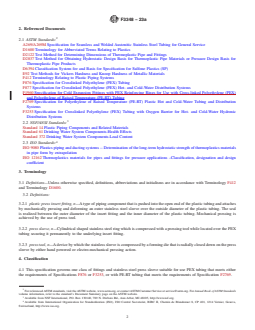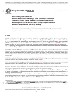 ASTM F3348-23a is a technical specification published by ASTM International. Its full title is "Standard Specification for Plastic Press Insert Fittings with Factory Assembled Stainless Steel Press Sleeve for SDR9 Cross-linked Polyethylene (PEX) Tubing and SDR9 Polyethylene of Raised Temperature (PE-RT) Tubing". This standard covers: SCOPE 1.1 This specification covers plastic press insert fittings with factory assembled stainless steel press sleeves incorporating 3 view holes and a tool locator ring. These fittings are for use with cross-linked polyethylene (PEX) tubing in nominal sizes 3/8 , 1/2 , 3/4 , 1, 11/4 , 11/2 , and 2 that meet the requirements for Specification F876 or F3253 and for use with polyethylene of raised temperature (PE-RT) tubing in nominal sizes 3/8 , 1/2 , 3/4 , 1, 11/4 , 11/2 , and 2 that meet the requirements of Specification F2769. These fittings are intended for use in 100 psi (690 kPa) cold- and hot-water distribution systems operating at temperatures up to and including 180 °F (82 °C). Included are the requirements for material, molded part properties, performance, workmanship, dimensions, and markings to be used on the fittings and sleeves. 1.1.1 When used with PEX tubing in accordance with Specification F876, the fittings covered by this specification are intended for use in, but not limited to, residential and commercial, hot- and cold-potable water distribution systems, water service lines, building supply lines, reclaimed water, fire protection, radiant heating and cooling systems, hydronic distribution systems, snow and ice melting systems, geothermal ground loops, district heating, turf conditioning, compressed air distribution and building services pipe. 1.1.2 When used with PEX tubing in accordance with Specification F3253, the fittings covered by this specification are intended for use in residential and commercial hydronic heating and cooling systems. 1.1.3 When used with PE-RT tubing in accordance with Specification F2769, the fittings covered by this specification are intended for use in residential and commercial, hot- and cold-potable water distribution systems, and building supply lines. 1.2 Units—The values stated in inch-pound units are to be regarded as standard. The values given in parentheses are mathematical conversions to SI units that are provided for information only and are not considered standard. 1.3 This standard does not purport to address all of the safety concerns, if any, associated with its use. It is the responsibility of the user of this standard to establish appropriate safety, health, and environmental practices and determine the applicability of regulatory limitations prior to use. 1.4 This international standard was developed in accordance with internationally recognized principles on standardization established in the Decision on Principles for the Development of International Standards, Guides and Recommendations issued by the World Trade Organization Technical Barriers to Trade (TBT) Committee.