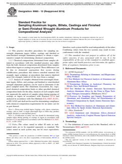 ASTM B985-12(2016) - Standard Practice for Sampling Aluminum Ingots, Billets, Castings and Finished or Semi-Finished Wrought Aluminum Products for Compositional Analysis establishes standardized procedures for obtaining representative samples from aluminum products. The intent is to ensure samples are suitable for accurate chemical analysis, ultimately verifying compliance with specified or registered chemical composition limits, such as those maintained by The Aluminum Association.