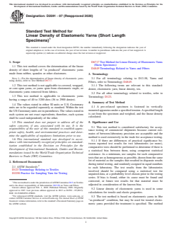 SIGNIFICANCE AND USE 5.1 This test method is considered satisfactory for acceptance testing of commercial shipments because current estimates of between-laboratory precision are acceptable and the method is used extensively in the trade for acceptance testing. 5.1.1 If there are differences of practical significance between reported test results for two laboratories (or more), comparative tests should be performed to determine if there is a statistical bias between them, using competent statistical assistance. As a minimum, use samples for such comparative tests that are as homogeneous as possible, drawn from the same lot of material as the samples that resulted in disparate results during initial testing, and randomly assigned in equal numbers to each laboratory. The test results from the laboratories involved should be compared using a statistical test for unpaired data, at a probability level chosen prior to the testing series. If bias is found, either its cause must be found and corrected, or future test results for that material must be adjusted in consideration of the known bias. 5.2 Linear density of elastomeric yarns is used in some calculations for tensile and elastic properties. 5.3 The test method is based on elastomeric yarns in lthe “as-produced” condition, but may be used for treated elastomeric yarns provided the treatment is specified. The method does not cover the removal of finish for the determination of linear density of “finish-free” elastomeric yarns. SCOPE 1.1 This test method covers the determination of the linear density of short lengths of “as produced” elastomeric yarns made from rubber, spandex or other elastomers. Note 1: For the determination of linear density of elastomeric yarns using skeins, refer to Test Method D6717. 1.2 This test method is not applicable to covered, wrapped, or core-spun yarns, or yarns spun from elastomeric staple, or elastomeric yarns removed from fabrics. 1.3 This test method is applicable to elastomeric yarns having a range of 40 to 3200 dtex (36 to 2900 denier). 1.4 The values stated in either SI units or U.S. Customary units are to be regarded separately as standard. Within the test the US Customary units are in parentheses. The values stated in each system are not exact equivalents; therefore, each system shall be used independently of the other. 1.5 This standard does not purport to address all of the safety concerns, if any, associated with its use. It is the responsibility of the user of this standard to establish appropriate safety, health, and environmental practices and determine the applicability of regulatory limitations prior to use. 1.6 This international standard was developed in accordance with internationally recognized principles on standardization established in the Decision on Principles for the Development of International Standards, Guides and Recommendations issued by the World Trade Organization Technical Barriers to Trade (TBT) Committee.