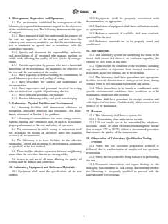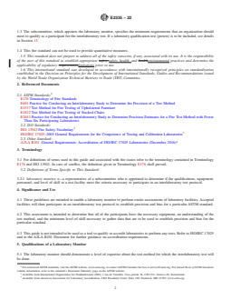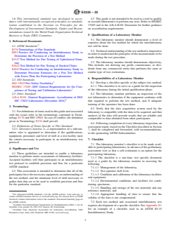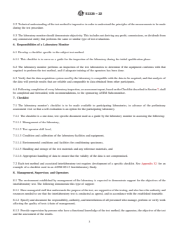 SIGNIFICANCE AND USE 4.1 These guidelines are intended to enable a laboratory monitor to perform onsite assessments of laboratory facilities. Accepted facilities will then participate in an interlaboratory test protocol to establish precision and bias for a particular ASTM standard. 4.2 This assessment is intended to determine that all of the participants have the necessary equipment, an understanding of the test method, and the minimum level of skill necessary to gather data that are to be used to establish precision and bias for the particular standard. 4.3 This guide is not intended to be used as a tool to qualify or accredit laboratories to perform any tests. Refer to ISO/IEC 17025 and to the A2LA R101 Document for further guidance on accreditation requirements. SCOPE 1.1 This guide provides a general outline, for use by a laboratory monitor, to assess the qualifications of a laboratory that has requested to participate in a specific ASTM interlaboratory test. 1.2 The preliminary assessment is based on observations made before initiation of any interlaboratory tests. 1.3 The subcommittee, which appoints the laboratory monitor, specifies the minimum requirements that an organization should meet to qualify as a participant for the interlaboratory test. If a laboratory qualification test (pretest) is to be included, see details in Section 13. 1.4 This fire standard can not be used to provide quantitative measures. 1.5 This standard does not purport to address all of the safety concerns, if any, associated with its use. It is the responsibility of the user of this standard to establish appropriate safety, health, and environmental practices and determine the applicability of regulatory limitations prior to use. 1.6 This international standard was developed in accordance with internationally recognized principles on standardization established in the Decision on Principles for the Development of International Standards, Guides and Recommendations issued by the World Trade Organization Technical Barriers to Trade (TBT) Committee.