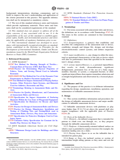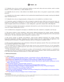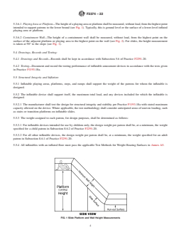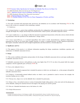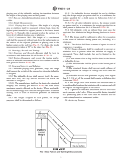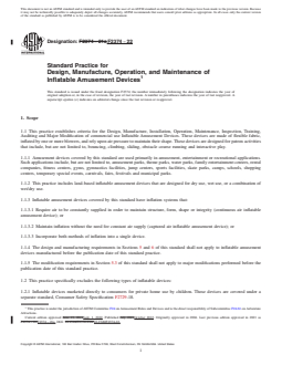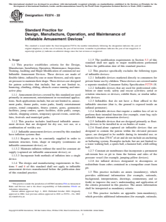 SIGNIFICANCE AND USE 4.1 The purpose of this practice is to delineate information regarding the design, manufacture, installation, operation, and maintenance of inflatable amusement devices. SCOPE 1.1 This practice establishes criteria for the Design, Manufacture, Installation, Operation, Maintenance, Inspection, Training, Auditing and Major Modification of commercial use Inflatable Amusement Devices. These devices are made of flexible fabric, inflated by one or more blowers, and rely upon air pressure to maintain their shape. These devices are designed for patron activities that include, but are not limited to, bouncing, climbing, sliding, obstacle course running and interactive play. 1.1.1 Amusement devices covered by this standard are used primarily in amusement, entertainment or recreational applications. Such applications include, but are not limited to, amusement parks, theme parks, water parks, family entertainment centers, rental companies, fitness centers, gyms, gymnastics facilities, jump centers, sports facilities, skate parks, camps, schools, shopping centers, temporary special events, carnivals, fairs, festivals and municipal parks. 1.1.2 This practice includes land-based inflatable amusement devices that are designed for dry use, wet use, or a combination of wet/dry use. 1.1.3 Inflatable amusement devices covered by this standard have inflation systems that: 1.1.3.1 Require air to be constantly supplied in order to maintain structure, form, shape or integrity (continuous air inflatable amusement device); or 1.1.3.2 Maintain inflation without the need for constant air supply (captured air inflatable amusement device); or 1.1.3.3 Incorporate both methods of inflation into a single device. 1.1.4 The design and manufacturing requirements in Sections 5 and 6 of this standard shall not apply to inflatable amusement devices manufactured before the publication date of this standard practice. 1.1.5 The modification requirements in Section 5.3 of this standard shall not apply to major modifications performed before the publication date of this standard practice. 1.2 This practice specifically excludes the following types of inflatable devices: 1.2.1 Inflatable devices marketed directly to consumers for private home use by children. Those devices are covered under a separate standard, Consumer Safety Specification F2729-18. 1.2.2 Inflatable devices that are used for professional exhibition or stunt work; safety and rescue activities; aerial or aviation structures or devices; exhibit floats; or similar inflatable devices. 1.2.3 Inflatables that do not have a floor affixed to the inflatable structure (that is, the ground is exposed inside an inflated perimeter). 1.2.4 Inflatable devices that require a sudden loss of air to perform their intended function (for example, stunt bag style inflatable impact attenuation devices). 1.2.5 Inflatable devices that are designed primarily as floating devices to be installed in or on bodies of water. 1.2.6 Stand-alone captured air inflatable devices that are designed to contain the patron within the elevated pressure space; are designed to be mobile during its intended use; or contain less than 270 ft3 of air and do not include an anchoring or ballasting system. Examples include, but are not limited to: a water walking ball, a sports ball, a hamster ball, a hill-rolling ball. 1.2.7 Constant air membranes that incorporate a permanent sub-terrain box or pit to form the bottom and sides of the pressure vessel (for example, jumping pillow devices). 1.2.8 Air inflated devices designated to decompress or redistribute foam cubes contained in a trampoline court foam pit. 1.3 This practice includes an annex (mandatory), which provides additional information (for example, rationale, background, interpretations, drawings, commentary, and so forth) to improve the user’s understanding and application of the criteria presented in this prac...