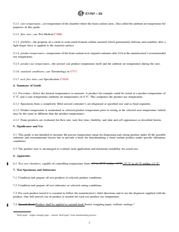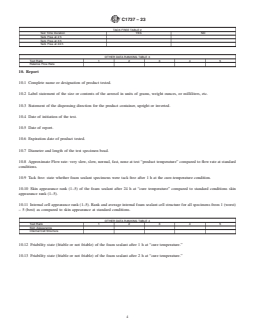 SIGNIFICANCE AND USE 5.1 This guide is not intended to measure the precise temperature range for dispensing and curing product under all the possible substrate and environmental factors but to provide a basis for benchmarking a foam sealant product under specific laboratory conditions. 5.2 The product user is encouraged to evaluate each application and determine suitability for actual use. SCOPE 1.1 This guide covers the general effects of temperature from the aerosol foam sealant (either polyurethane or latex types) under the use temperatures. 1.2 The guide is intended to estimate the observed product dispensing characteristics and foam quality of aerosol foam dispensed or cured, or both, at specific temperatures and standard conditions. 1.3 Such foam sealants are primarily intended to reduce air movement in and out of building enclosures. 1.4 Currently two main foam sealant types are applicable to this standard: single component polyurethane and latex. 1.5 The values stated in SI units are to be regarded as standard. No other units of measurement are included in this standard. 1.6 There are no other known test methods specific for measuring the product temperature range for aerosol foam sealant. 1.7 This standard does not purport to address all of the safety concerns, if any, associated with its use. It is the responsibility of the user of this standard to establish appropriate safety, health, and environmental practices and determine the applicability of regulatory limitations prior to use. 1.8 This international standard was developed in accordance with internationally recognized principles on standardization established in the Decision on Principles for the Development of International Standards, Guides and Recommendations issued by the World Trade Organization Technical Barriers to Trade (TBT) Committee.