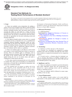SIGNIFICANCE AND USE 4.1 These test methods are intended to provide information from which applicable design data and specifications are derived for a given anchorage device and for qualifying anchors or anchorage devices. 4.2 These test methods shall be followed to ensure reproducibility of the test data. SCOPE 1.1 These test methods cover instructions for making a variety of tests for the strength of the adhesive bond developed between a steel anchor and the surface of a hole in concrete or masonry (including masonry units and mortar joints) and for assessing the effects on such bond of a variety of factors including elevated temperature, fire, moisture, and freezing and thawing action. The specifier or manufacturer shall select those tests that are appropriate for the given anchoring system and intended application. 1.2 The adhesive-bonded anchor system refers to a smooth or deformed steel bar or threaded rod, set in a predrilled hole containing chemical bonding compounds. Loads are transferred mainly by the bond of the adhesive both to the anchor and the surrounding elements along the sides of the hole. For anchoring systems made of significantly different materials, these test methods shall be taken as a guideline. 1.3 These test methods apply to all adhesives used to bond steel anchors or steel reinforcement bars (rebar) to concrete or masonry. These test methods apply to anchorages used in uncracked concrete or masonry. They do not apply to the use of the anchor in the concrete tension zone. The usual forces applied during the tests are in tension, shear, and under a combination of both tension and shear. 1.4 The values stated in inch-pound units are to be regarded as standard. The values given in parentheses are mathematical conversions to SI units that are provided for information only and are not considered standard. 1.5 This standard does not purport to address all of the safety concerns, if any, associated with its use. It is the responsibility of the user of this standard to establish appropriate safety, health, and environmental practices and determine the applicability of regulatory limitations prior to use. 1.6 This international standard was developed in accordance with internationally recognized principles on standardization established in the Decision on Principles for the Development of International Standards, Guides and Recommendations issued by the World Trade Organization Technical Barriers to Trade (TBT) Committee.
