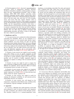 SIGNIFICANCE AND USE 5.1 An acute toxicity test is conducted to obtain information concerning the immediate effects on test organisms of a short-term exposure to a test material under specific experimental conditions. An acute toxicity test does not provide information about whether delayed effects will occur, although a post-exposure observation period, with appropriate feeding, if necessary, might provide such information. Bioavailability of the test substance may also differ between real-world exposures and laboratory exposures due to site-specific water quality conditions (see Guides E1192, E1563, and E2455). 5.2 Results of acute toxicity tests might be used to predict acute effects likely to occur on aquatic organisms in field situations as a result of exposure under comparable conditions, except that (1) motile organisms might avoid exposure when possible, and (2) toxicity to benthic organisms might be dependent on sorption or settling of the test material onto the substrate. 5.3 Results of acute tests might be used to compare the acute sensitivities of different species and the acute toxicities of different test materials, and to study the effects of various environmental factors on results of such tests. 5.4 Results of acute toxicity tests might be an important consideration when assessing the hazards of materials to aquatic organisms (see Guide E1023) or when deriving water quality criteria for aquatic organisms (3). 5.5 Results of acute toxicity tests might be useful for studying the biological availability of, and structure-activity relationships between, test materials. 5.6 Results of acute toxicity tests will depend on the temperature, composition of the dilution water, condition of the test organisms, exposure technique, and other factors. SCOPE 1.1 This guide (1)2 describes procedures for obtaining laboratory data concerning the adverse effects (for example, lethality and immobility) of a test material added to dilution water, but not to food, on certain species of freshwater and saltwater fishes, macroinvertebrates, and amphibians, usually during 2 to 4-day exposures, depending on the species. These procedures will probably be useful for conducting acute toxicity tests with many other aquatic species, although modifications might be necessary. 1.2 Other modifications of these procedures might be justified by special needs or circumstances such as meeting specific study goals, regulatory needs, or to accommodate specific test organism life stages. Although using appropriate procedures is more important than following prescribed procedures, results of tests conducted using unusual or novel procedures are not likely to be comparable to results of many other tests. Comparison of results obtained using modified and unmodified versions of these procedures might provide useful information concerning new concepts and procedures for conducting acute tests. 1.3 This guide describes tests using three basic exposure techniques: static, renewal, and flow-through. Selection of the technique to use in a specific situation will depend on the needs of the investigator and on available resources. Tests using the static technique provide the most easily obtained measure of acute toxicity, but conditions often change substantially during static tests; therefore, static tests should not last longer than 96 h, and test organisms should not be fed during such tests unless the test organisms are severely stressed without feeding over 48 h. Static tests should probably not be conducted on materials that have a high oxygen demand, are highly volatile, are rapidly transformed biologically or chemically in aqueous solution, or are removed from test solutions in substantial quantities by the test chambers or organisms during the test. Because the pH and concentrations of dissolved oxygen and test material are maintained at desired levels and degradation and metabolic products are removed, tests using ren...