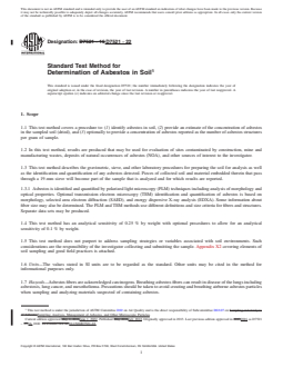 1.1 This test method covers a procedure to: (1) identify asbestos in soil, (2) provide an estimate of the concentration of asbestos in the sampled soil (dried), and (3) optionally to provide a concentration of asbestos reported as the number of asbestos structures per gram of sample.