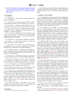 ASTM C1274-12(2020) is a standard published by ASTM International. Its full title is "Standard Test Method for Advanced Ceramic Specific Surface Area by Physical Adsorption". This standard covers: SIGNIFICANCE AND USE 5.1 Advanced ceramic powders and porous ceramic bodies often have a very fine particulate morphology and structure that are marked by high surface-to-volume (S-V) ratios. These ceramics with high S-V ratios commonly exhibit enhanced chemical reactivity and lower sintering temperatures. Results of many intermediate and final ceramic processing steps are controlled by, or related to, the specific surface area of the advanced ceramic. The functionality of ceramic adsorbents, separation filters and membranes, catalysts, chromatographic carriers, coatings, and pigments often depends on the amount and distribution of the porosity and its resulting effect on the specific surface area. 5.2 This test method determines the specific surface area of advanced ceramic powders and porous bodies. Both suppliers and users of advanced ceramics can use knowledge of the surface area of these ceramics for material development and comparison, product characterization, design data, quality control, and engineering/ production specifications. SCOPE 1.1 This test method covers the determination of the surface area of advanced ceramic materials (in a solid form) based on multilayer physisorption of gas in accordance with the method of Brunauer, Emmett, and Teller (BET) (1)2 and based on IUPAC Recommendations (1984 and 1994) (2, 3). This test method specifies general procedures that are applicable to many commercial physical adsorption instruments. This test method provides specific sample outgassing procedures for selected common ceramic materials, including: amorphous and crystalline silicas, TiO2, kaolin, silicon nitride, silicon carbide, zirconium oxide, etc. The multipoint BET (1) equation along with the single-point approximation of the BET equation are the basis for all calculations. This test method is appropriate for measuring surface areas of advanced ceramic powders down to at least 0.05 m2 (if in addition to nitrogen, krypton at 77.35 K is utilized as an adsorptive). 1.2 This test method does not include all existing procedures appropriate for outgassing of advanced ceramic materials. However, it provides a comprehensive summary of procedures recommended in the literature for selected types of ceramic materials. The investigator shall determine the appropriateness of listed procedures. 1.3 The values stated in SI units are to be regarded as standard. State all numerical values in terms of SI units unless specific instrumentation software reports surface area using alternate units. In this case, provide both reported and equivalent SI units in the final written report. It is commonly accepted and customary (in physical adsorption and related fields) to report the (specific) surface area of solids as m2/g and, as a convention, many instruments (as well as certificates of reference materials) report surface area as m2 g–1, instead of using SI units (m2 kg–1). 1.4 This standard does not purport to address all of the safety concerns, if any, associated with its use. It is the responsibility of the user of this standard to establish appropriate safety, health, and environmental practices and determine the applicability of regulatory limitations prior to use. 1.5 This international standard was developed in accordance with internationally recognized principles on standardization established in the Decision on Principles for the Development of International Standards, Guides and Recommendations issued by the World Trade Organization Technical Barriers to Trade (TBT) Committee.
