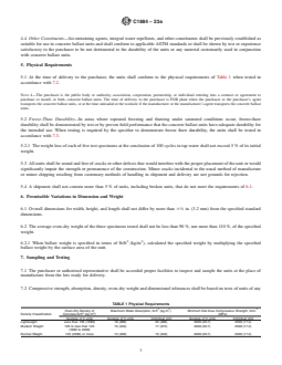 - Specifies detailed sampling and testing procedures (referencing ASTM C140/C140M and C1262/C1262M).