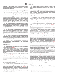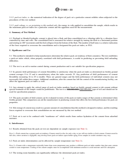 SIGNIFICANCE AND USE 5.1 This method is intended to help manufacturers determine the relative pack-set tendency of their cement(s). The test establishes a pack-set index which, when properly correlated with field performance, is useful in predicting or preventing field unloading difficulties. 5.2 The test is an aid to routine control during cement production and is not suitable for specification purposes. 5.3 In general, field performance of cement flowability is satisfactory when the pack-set index as determined on freshly ground cement averages 0 to 15 and is unsatisfactory when the index exceeds 25. Any prediction of field performance of cement flowability measuring 16 to 25 is tenable. These are general ranges and the field performance of individual cements may not necessarily fall within these ranges. Additional conditions, after the cement has left the control of the manufacturing facility, can affect the apparent pack set index as well. 5.4 Any attempt to apply the critical range of pack-set index numbers based on freshly ground cement to job cement without special treatment of the sample would be problematic. The test is a “GO-NO-GO” type of test and should not be used for specification purposes. 5.5 The pack-set index of field cement can be evaluated in terms of the pack-set index ranges of that cement as determined when freshly-ground. This comparison can aid the manufacturer in producing cement that offers the best field performance for pack-set properties. 5.6 Silo storage of cement may result in a greater amount of consolidation than this method is designed to induce, and the resulting forces required to overcome that consolidation are not measured by this test method. 5.7 Pack set is not to be confused with “warehouse set” which results from surface hydration of the cement from adsorbed moisture. SCOPE 1.1 This test method covers the determination of the pack-set index, which provides an indication of the mechanical force needed to overcome the consolidation of portland and blended hydraulic cements. 1.2 The pack-set index number provides a numerical value useful for manufacturers who desire to measure and control the effect that vibration-induced consolidation has upon the manufactured cement. 1.3 The values stated in SI units are to be regarded as standard. No other units of measurement are included in this standard. Values stated in SI units shall be obtained by measurement in SI units or by appropriate conversion, using the rules of Conversion and rounding given in Standard IEEE/ASTM SI 10, of measurements made in other units. 1.4 This standard does not purport to address all of the safety concerns, if any, associated with its use. It is the responsibility of the user of this standard to establish appropriate safety, health, and environmental practices and determine the applicability of regulatory limitations prior to use. (WARNING—Fresh hydraulic-cementitious mixtures are caustic and may cause chemical burns to skin and tissue upon prolonged exposure.2) 1.5 This international standard was developed in accordance with internationally recognized principles on standardization established in the Decision on Principles for the Development of International Standards, Guides and Recommendations issued by the World Trade Organization Technical Barriers to Trade (TBT) Committee.