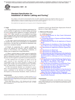 ASTM C841-23 is a technical specification published by ASTM International. Its full title is "Standard Specification for Installation of Interior Lathing and Furring". This standard covers: ABSTRACT This specification covers the minimum requirements for, and the methods of application of, interior lathing and furring to receive gypsum plaster applied. Other materials are not prohibited from being used provided that their physical characteristics and durability under conditions of usage are at least equal in performance to those described. All materials shall be kept dry, preferably by being stored inside. Where necessary to be stored outside, materials shall be stacked off the ground, supported on a level platform, and protected from the weather and surface contamination. Materials shall be neatly stacked flat with care taken to avoid damage to edges, ends, or surfaces. The materials to be used are the following: tie wire and hanger wire, gypsum lath, expanded metal lath, welded wire lath, woven wire lath, nails, screws, staples, paper, and accessories such as control joints, cornerite, channels, rod and flat hangers, clips, and striplath. In general, during installation, the following shall be required: application of gypsum lath to supports, application of gypsum lath to wood supports, application of gypsum lath to metal supports, studless solid partitions (gypsum lath and plaster), application of metal plaster bases to framing members, studless solid partitions (metal lath and plaster), suspended and furred ceilings (metal lath and gypsum lath construction), main runners, cross furring, and metal furring for walls. SCOPE 1.1 This specification covers the minimum requirements for, and the methods of application of, interior lathing and furring to receive gypsum plaster applied in accordance with Specification C842. Other materials are not prohibited from being used provided that their physical characteristics and durability under conditions of usage are at least equal in performance to those described. 1.2 The values stated in inch-pound units are to be regarded as standard. The values given in parentheses are mathematical conversions to SI units that are provided for information only and are not considered standard. 1.3 Details of construction for a specific assembly to achieve the required fire resistance shall be obtained from reports of fire-resistance tests, engineering evaluations, or listings from recognized fire testing laboratories. 1.4 Where a specific degree of sound control is required for plastered assemblies and constructions, details of construction shall be obtained from reports of acoustical tests of assemblies that have met the required or specified acoustical performance. 1.5 This standard does not purport to address all of the safety concerns, if any, associated with its use. It is the responsibility of the user of this standard to establish appropriate safety, health, and environmental practices and determine the applicability of regulatory limitations prior to use. 1.6 This international standard was developed in accordance with internationally recognized principles on standardization established in the Decision on Principles for the Development of International Standards, Guides and Recommendations issued by the World Trade Organization Technical Barriers to Trade (TBT) Committee.