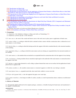 ABSTRACT This specification covers the minimum requirements for, and the methods of application of, interior lathing and furring to receive gypsum plaster applied. Other materials are not prohibited from being used provided that their physical characteristics and durability under conditions of usage are at least equal in performance to those described. All materials shall be kept dry, preferably by being stored inside. Where necessary to be stored outside, materials shall be stacked off the ground, supported on a level platform, and protected from the weather and surface contamination. Materials shall be neatly stacked flat with care taken to avoid damage to edges, ends, or surfaces. The materials to be used are the following: tie wire and hanger wire, gypsum lath, expanded metal lath, welded wire lath, woven wire lath, nails, screws, staples, paper, and accessories such as control joints, cornerite, channels, rod and flat hangers, clips, and striplath. In general, during installation, the following shall be required: application of gypsum lath to supports, application of gypsum lath to wood supports, application of gypsum lath to metal supports, studless solid partitions (gypsum lath and plaster), application of metal plaster bases to framing members, studless solid partitions (metal lath and plaster), suspended and furred ceilings (metal lath and gypsum lath construction), main runners, cross furring, and metal furring for walls. SCOPE 1.1 This specification covers the minimum requirements for, and the methods of application of, interior lathing and furring to receive gypsum plaster applied in accordance with Specification C842. Other materials are not prohibited from being used provided that their physical characteristics and durability under conditions of usage are at least equal in performance to those described. 1.2 The values stated in inch-pound units are to be regarded as standard. The values given in parentheses are mathematical conversions to SI units that are provided for information only and are not considered standard. 1.3 Details of construction for a specific assembly to achieve the required fire resistance shall be obtained from reports of fire-resistance tests, engineering evaluations, or listings from recognized fire testing laboratories. 1.4 Where a specific degree of sound control is required for plastered assemblies and constructions, details of construction shall be obtained from reports of acoustical tests of assemblies that have met the required or specified acoustical performance. 1.5 This standard does not purport to address all of the safety concerns, if any, associated with its use. It is the responsibility of the user of this standard to establish appropriate safety, health, and environmental practices and determine the applicability of regulatory limitations prior to use. 1.6 This international standard was developed in accordance with internationally recognized principles on standardization established in the Decision on Principles for the Development of International Standards, Guides and Recommendations issued by the World Trade Organization Technical Barriers to Trade (TBT) Committee.