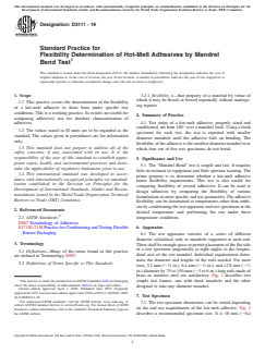 ASTM D3111-19 is a standard published by ASTM International. Its full title is "Standard Practice for Flexibility Determination of Hot-Melt Adhesives by Mandrel Bend Test". This standard covers: SIGNIFICANCE AND USE 5.1 The “Mandrel Bend” test is simple and fast. It requires little investment in equipment and little operator training. The prime purpose is to determine whether a hot-melt adhesive meets flexibility requirements. This test is also useful for comparing flexibility of several adhesives. It can be used to design adhesives by comparing the flexibility of various formulations to meet specific end use parameters. The adhesive flexibility can be determined at temperatures other than ambient by conditioning the test apparatus and test specimens at the desired temperature and performing the test under these temperature conditions. SCOPE 1.1 This practice covers the determination of the flexibility of a hot-melt adhesive in sheet form under specific test conditions. This is a working practice. Its results are useful for comparing adhesives, not for absolute characterization of adhesives. 1.2 The values stated in SI units are to be regarded as the standard. The values given in parentheses are for information only. 1.3 This standard does not purport to address all of the safety concerns, if any, associated with its use. It is the responsibility of the user of this standard to establish appropriate safety, health, and environmental practices and determine the applicability of regulatory limitations prior to use. 1.4 This international standard was developed in accordance with internationally recognized principles on standardization established in the Decision on Principles for the Development of International Standards, Guides and Recommendations issued by the World Trade Organization Technical Barriers to Trade (TBT) Committee.