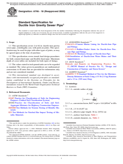 ASTM A746-18(2022) is a technical specification published by ASTM International. Its full title is "Standard Specification for Ductile Iron Gravity Sewer Pipe". This standard covers: ABSTRACT This specification covers ductile iron gravity sewer pipe centrifugally cast with push-on joints. This also covers trench load design procedures for both cement-lined pipe and flexible-lined pipe. Maximum depths of cover tables are included for both types of linings. Each pipe shall be subjected to a hydrostatic test and maybe performed either before or after the outside coating and inside coating have been applied, but shall be performed before the application of cement-mortar lining or of a special lining. The standard acceptance tests and additional control tests shall also be performed. SCOPE 1.1 This specification covers 4 to 64 in. ductile iron gravity sewer pipe, centrifugally cast, with push-on joints. This specification may be used for pipe with other types of joints, as may be agreed upon at the time of purchase. 1.2 This specification covers trench load design procedures for both cement-lined pipe and flexible-lined pipe. Maximum depth of cover tables are included for both types of linings. 1.3 The values stated in inch-pound units are to be regarded as standard. The values given in parentheses are mathematical conversions to SI units that are provided for information only and are not considered standard. 1.4 This international standard was developed in accordance with internationally recognized principles on standardization established in the Decision on Principles for the Development of International Standards, Guides and Recommendations issued by the World Trade Organization Technical Barriers to Trade (TBT) Committee.
