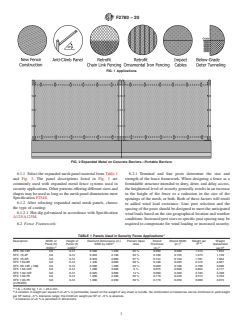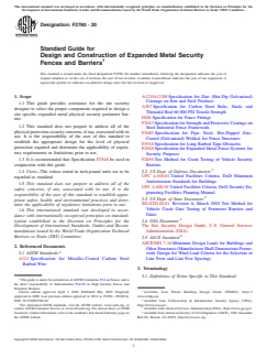 ASTM F2780-20 is a guide published by ASTM International. Its full title is "Standard Guide for Design and Construction of Expanded Metal Security Fences and Barriers". This standard covers: SCOPE 1.1 This guide provides assistance for the site security designer to select the proper components required to design a site specific expanded metal physical security perimeter barrier. 1.2 This standard does not purport to address all of the physical protection security concerns, if any, associated with its use. It is the responsibility of the user of this standard to establish the appropriate design for the level of physical protection required and determine the applicability of regulatory requirements or limitations prior to use. 1.3 It is recommended that Specification F2548 be used in conjunction with this guide. 1.4 Units—The values stated in inch-pound units are to be regarded as standard. 1.5 This standard does not purport to address all of the safety concerns, if any, associated with its use. It is the responsibility of the user of this standard to establish appropriate safety, health, and environmental practices and determine the applicability of regulatory limitations prior to use. 1.6 This international standard was developed in accordance with internationally recognized principles on standardization established in the Decision on Principles for the Development of International Standards, Guides and Recommendations issued by the World Trade Organization Technical Barriers to Trade (TBT) Committee.