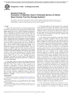 ASTM C1562-10(2018), titled Standard Guide for Evaluation of Materials Used in Extended Service of Interim Spent Nuclear Fuel Dry Storage Systems, provides essential guidance for evaluating the performance of materials used in the dry storage of spent nuclear fuel (SNF) over extended periods. Developed by ASTM International, this standard assists licensees and licensors in assessing the suitability of both SNF assemblies and the key components of dry cask storage systems (DCSS) at independent spent fuel storage installations (ISFSIs), especially as these facilities seek license renewals beyond the initial regulatory periods.