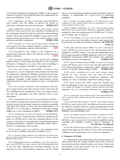 1.1 Part of the total inventory of commercial spent nuclear fuel (SNF) is stored in dry cask storage systems (DCSS) under licenses granted by the U.S. Nuclear Regulatory Commission (NRC). The purpose of this guide is to provide information to assist in supporting the renewal of these licenses, safely and without removal of the SNF from its licensed confinement, for periods beyond those governed by the term of the original license. This guide provides information on materials behavior under conditions that may be important to safety evaluations for the extended service of the renewal period. This guide is written for DCSS containing light water reactor (LWR) fuel that is clad in zirconium alloy material and stored in accordance with the Code of Federal Regulations (CFR), at an independent spent-fuel storage installation (ISFSI).2 The components of an ISFSI, addressed in this document, include the commercial SNF, canister, cask, and all parts of the storage installation including the ISFSI pad. The language of this guide is based, in part, on the requirements for a dry SNF storage license that is granted, by the U.S. Nuclear Regulatory Commission (NRC), for up to 20 years. Although government regulations may differ for various nations, the guidance on materials properties and behavior given here is expected to have broad applicability.