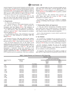 ABSTRACT This specification covers chlorinated poly(vinyl chloride) (CPVC) pipes made in standard thermoplastic pipe dimension ratios and pressure rated for water. These pipes are intended for use in the distribution of pressurized liquids only, which are chemically compatible with the piping materials. Established here are the criteria for classifying both CPVC plastic pipe materials and finished CPVC plastic pipe products, as well as the requirements and associated test methods for the material, workmanship, dimensions, sustained pressure, burst pressure, flattening resistance, and extrusion quality. SCOPE 1.1 This specification covers chlorinated poly(vinyl chloride) (CPVC) pipe made in standard thermoplastic pipe dimension ratios and pressure rated for water (see Appendix X1). Included are criteria for classifying CPVC plastic pipe materials and CPVC plastic pipe, and requirements and test methods for materials, workmanship, dimensions, sustained pressure, burst pressure, flattening, and extrusion quality. Methods of marking are also given. Note 1: The CPVC pipe covered by this specification was covered previously in Specification D2241. Note 2: The sustained and burst pressure test requirements and the pressure ratings in the Appendix X1 are calculated from stress values obtained from tests made on pipe 2 in. [50 mm] and smaller. However, tests on larger pipe have shown these stress values to be valid. 1.2 The products covered by this specification are intended for use with the distribution of pressurized liquids only, which are chemically compatible with the piping materials. Due to inherent hazards associated with testing components and systems with compressed air or other compressed gases some manufacturers do not allow pneumatic testing of their products. Consult with specific product/component manufacturers for their specific testing procedures prior to pneumatic testing. Note 3: Pressurized (compressed) air or other compressed gases contain large amounts of stored energy which present serious safety hazards should a system fail for any reason. 1.3 The text of this specification references notes, footnotes, and appendixes which provide explanatory material. These notes and footnotes (excluding those in tables and figures) shall not be considered as requirements of the specification. 1.4 The values stated in either SI units or inch-pound units are to be regarded separately as standard. The values stated in each system may not be exact equivalents; therefore, each system shall be used independently of the other. Combining values from the two systems may result in non-conformance with the standard. Within the text, the SI units are shown in brackets. 1.5 The following safety hazards caveat pertains only to the test methods portion, Section 8, of this specification: This standard does not purport to address all of the safety concerns, if any, associated with its use. It is the responsibility of the user of this standard to establish appropriate safety, health, and environmental practices and determine the applicability of regulatory limitations prior to use. A specific precautionary statement is given in 8.4.1. 1.6 This international standard was developed in accordance with internationally recognized principles on standardization established in the Decision on Principles for the Development of International Standards, Guides and Recommendations issued by the World Trade Organization Technical Barriers to Trade (TBT) Committee.