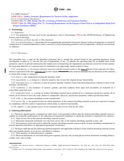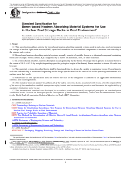 ABSTRACT This specification defines essential criteria for all material combinations in boron-based neutron-absorbing material systems used for nuclear spent fuel storage racks in nuclear light water reactors, spent-fuel assemblies, or disassembled components. The boron-based neutron absorbing materials normally consist of metallic boron or a boron-containing boron compound supported by a matrix of aluminum, steel, or other materials. Material systems covered in this specification should always be capable of maintaining a B10 areal density that can support the required subcriticality depending on the design specification for service life. SCOPE 1.1 This specification defines criteria for boron-based neutron absorbing material systems used in racks in a pool environment for storage of nuclear light water reactor (LWR) spent-fuel assemblies or disassembled components to maintain sub-criticality in the storage rack system. 1.2 Boron-based neutron absorbing material systems normally consist of metallic boron or a chemical compound containing boron (for example, boron carbide, B4C) supported by a matrix of aluminum, steel, or other materials. 1.3 In a boron-based absorber, neutron absorption occurs primarily by the boron-10 isotope that is present in natural boron to the extent of 18.3 ± 0.2 % by weight (depending upon the geological origin of the boron). Boron enriched in boron-10 could also be used. 1.4 The materials systems described herein shall be functional (that is, always be capable to maintain a boron-10 areal density such that subcriticality is maintained depending on the design specification for the service life in the operating environment of a nuclear spent fuel pool). 1.5 Observance of this specification does not relieve the user of the obligation to conform to all applicable international, national, and local regulations. 1.6 This standard does not purport to address all of the safety concerns, if any, associated with its use. It is the responsibility of the user of this standard to establish appropriate safety, health, and environmental practices and determine the applicability of regulatory limitations prior to use. 1.7 This international standard was developed in accordance with internationally recognized principles on standardization established in the Decision on Principles for the Development of International Standards, Guides and Recommendations issued by the World Trade Organization Technical Barriers to Trade (TBT) Committee.