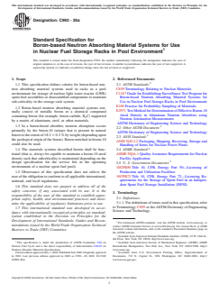 ASTM C992-20a is a technical specification published by ASTM International. Its full title is "Standard Specification for Boron-based Neutron Absorbing Material Systems for Use in Nuclear Fuel Storage Racks in Pool Environment". This standard covers: ABSTRACT This specification defines essential criteria for all material combinations in boron-based neutron-absorbing material systems used for nuclear spent fuel storage racks in nuclear light water reactors, spent-fuel assemblies, or disassembled components. The boron-based neutron absorbing materials normally consist of metallic boron or a boron-containing boron compound supported by a matrix of aluminum, steel, or other materials. Material systems covered in this specification should always be capable of maintaining a B10 areal density that can support the required subcriticality depending on the design specification for service life. SCOPE 1.1 This specification defines criteria for boron-based neutron absorbing material systems used in racks in a pool environment for storage of nuclear light water reactor (LWR) spent-fuel assemblies or disassembled components to maintain sub-criticality in the storage rack system. 1.2 Boron-based neutron absorbing material systems normally consist of metallic boron or a chemical compound containing boron (for example, boron carbide, B4C) supported by a matrix of aluminum, steel, or other materials. 1.3 In a boron-based absorber, neutron absorption occurs primarily by the boron-10 isotope that is present in natural boron to the extent of 18.3 ± 0.2 % by weight (depending upon the geological origin of the boron). Boron enriched in boron-10 could also be used. 1.4 The materials systems described herein shall be functional (that is, always be capable to maintain a boron-10 areal density such that subcriticality is maintained depending on the design specification for the service life in the operating environment of a nuclear spent fuel pool). 1.5 Observance of this specification does not relieve the user of the obligation to conform to all applicable international, national, and local regulations. 1.6 This standard does not purport to address all of the safety concerns, if any, associated with its use. It is the responsibility of the user of this standard to establish appropriate safety, health, and environmental practices and determine the applicability of regulatory limitations prior to use. 1.7 This international standard was developed in accordance with internationally recognized principles on standardization established in the Decision on Principles for the Development of International Standards, Guides and Recommendations issued by the World Trade Organization Technical Barriers to Trade (TBT) Committee.