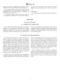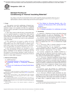 SIGNIFICANCE AND USE 5.1 The conditioning prescribed in this recommended practice is designed to obtain reproducible test results on thermal insulating materials. Results of tests obtained on these materials under uncontrolled atmospheric conditions are not comparable with each other. Some of the physical properties of thermal insulating materials are influenced by relative humidity and temperature in a manner that affects the results of tests. In this regard, such information is provided in pertinent material specifications and test methods by stating the physical properties relative to the specific ambient or test conditions. Note 1: In some cases (for example, dimensionally unstable materials), the dry mass cannot easily be established and original mass has to be used. SCOPE 1.1 This practice covers the conditioning of thermal insulating materials for tests. Since prior exposure of insulating materials to high or low humidity will affect the equilibrium moisture content, a procedure is also given for preconditioning the materials. 1.2 The values stated in either SI units or inch-pound units are to be regarded separately as standard. The values stated in each system may not be exact equivalents; therefore, each system shall be used independently of the other. Combining values from the two systems may result in non-conformance with the standard. 1.3 This standard does not purport to address all of the safety concerns, if any, associated with its use. It is the responsibility of the user of this standard to establish appropriate safety, health, and environmental practices and determine the applicability of regulatory limitations prior to use. 1.4 This international standard was developed in accordance with internationally recognized principles on standardization established in the Decision on Principles for the Development of International Standards, Guides and Recommendations issued by the World Trade Organization Technical Barriers to Trade (TBT) Committee.
