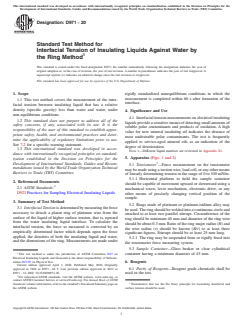 ASTM D971-20 is a standard published by ASTM International. Its full title is "Standard Test Method for Interfacial Tension of Insulating Liquids Against Water by the Ring Method". This standard covers: SIGNIFICANCE AND USE 4.1 Interfacial tension measurements on electrical insulating liquids provide a sensitive means of detecting small amounts of soluble polar contaminants and products of oxidation. A high value for new mineral insulating oil indicates the absence of most undesirable polar contaminants. The test is frequently applied to service-aged mineral oils as an indication of the degree of deterioration. Note 1: Different liquid matrixes are reviewed in Appendix X1. SCOPE 1.1 This test method covers the measurement of the interfacial tension between insulating liquid that has a relative density (specific gravity) less than water and water, under non-equilibrium conditions. 1.2 This standard does not purport to address all of the safety concerns, if any, associated with its use. It is the responsibility of the user of this standard to establish appropriate safety, health, and environmental practices and determine the applicability of regulatory limitations prior to use. See 7.2 for a specific warning statement. 1.3 This international standard was developed in accordance with internationally recognized principles on standardization established in the Decision on Principles for the Development of International Standards, Guides and Recommendations issued by the World Trade Organization Technical Barriers to Trade (TBT) Committee.