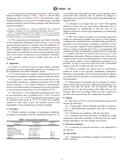 SIGNIFICANCE AND USE 4.1 Many materials from which containers and packages are made, especially cellulosic materials, undergo changes in physical properties as the temperature and the relative humidity (RH) to which they are exposed are varied. Therefore, the package should be placed and kept in a specified atmosphere for a length of time such that subsequent measurements of physical properties will be meaningful and reproducible. 4.2 The conditions described in this practice are either historically accepted standard conditions or special laboratory conditions chosen to represent particular phases of the distribution environment. These special conditions do not necessarily duplicate actual field conditions, but tend to simulate them and have effects on packages and materials which may be related to their field performance. SCOPE 1.1 This practice provides for standard and special conditioning and testing atmospheres that may be used to simulate particular field conditions that a container, package, or packaging component may encounter during its life or testing cycle. 1.2 This practice describes procedures for conditioning these containers, packages, or packaging components so that they approach or reach equilibrium with the atmosphere to which they may be exposed. This standard is commonly used for conditioning when conducting transit simulation tests. 1.3 Practice D685 should be used as the relevant conditioning standard when quantification of box compression strength at standard atmosphere conditions is required. 1.4 This standard does not purport to address all of the safety concerns, if any, associated with its use. It is the responsibility of the user of this standard to establish appropriate safety, health, and environmental practices and determine the applicability of regulatory limitations prior to use. 1.5 This international standard was developed in accordance with internationally recognized principles on standardization established in the Decision on Principles for the Development of International Standards, Guides and Recommendations issued by the World Trade Organization Technical Barriers to Trade (TBT) Committee.