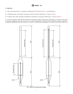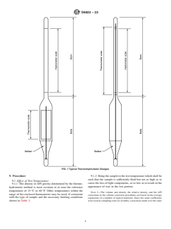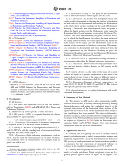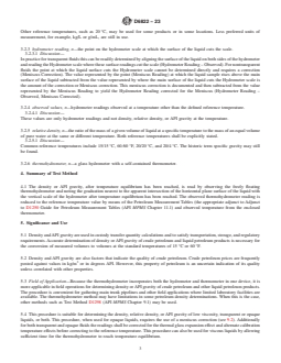 SIGNIFICANCE AND USE 5.1 Density and API gravity are used in custody transfer quantity calculations and to satisfy transportation, storage, and regulatory requirements. Accurate determination of density or API gravity of crude petroleum and liquid petroleum products is necessary for the conversion of measured volumes to volumes at the standard temperatures of 15 °C or 60 °F. 5.2 Density and API gravity are also factors that indicate the quality of crude petroleum. Crude petroleum prices are frequently posted against values in kg/m3 or in degrees API. However, this property of petroleum is an uncertain indication of its quality unless correlated with other properties. 5.3 Field of Application—Because the thermohydrometer incorporates both the hydrometer and thermometer in one device, it is more applicable in field operations for determining density or API gravity of crude petroleum and other liquid petroleum products. The procedure is convenient for gathering main trunk pipelines and other field applications where limited laboratory facilities are available. The thermohydrometer method may have limitations in some petroleum density determinations. When this is the case, other methods such as Test Method D1298 (API MPMS Chapter 9.1) may be used. 5.4 This procedure is suitable for determining the density, relative density, or API gravity of low viscosity, transparent or opaque liquids, or both. This procedure, when used for opaque liquids, requires the use of a meniscus correction (see 9.2). Additionally for both transparent and opaque fluids the readings shall be corrected for the thermal glass expansion effect and alternate calibration temperature effects before correcting to the reference temperature. This procedure can also be used for viscous liquids by allowing sufficient time for the thermohydrometer to reach temperature equilibrium. SCOPE 1.1 This test method covers the determination, using a glass thermohydrometer in conjunction with a series of calculations, of the density, relative density, or API gravity of crude petroleum, petroleum products, or mixtures of petroleum and nonpetroleum products normally handled as liquids and having a Reid vapor pressures of 101.325 kPa (14.696 psi) or less. Values are determined at existing temperatures and corrected to 15 °C or 60 °F by means of a series of calculations and international standard tables. 1.2 The initial thermohydrometer readings obtained are uncorrected hydrometer readings and not density measurements. Readings are measured on a thermohydrometer at either the reference temperature or at another convenient temperature, and readings are corrected for the meniscus effect, the thermal glass expansion effect, alternate calibration temperature effects and to the reference temperature by means of calculations and Adjunct to D1250 Guide for Use of the Petroleum Measurement Tables (API MPMS Chapter 11.1). 1.3 Readings determined as density, relative density, or API gravity can be converted to equivalent values in the other units or alternate reference temperatures by means of Interconversion Procedures (API MPMS Chapter 11.5) or Adjunct to D1250 Guide for Use of the Petroleum Measurement Tables (API MPMS Chapter 11.1), or both, or tables as applicable. 1.4 The initial thermohydrometer reading shall be recorded before performing any calculations. The calculations required in Section 9 shall be applied to the initial thermohydrometer reading with observations and results reported as required by Section 11 prior to use in a subsequent calculation procedure (measurement ticket calculation, meter factor calculation, or base prover volume determination). 1.5 Annex A1 contains a procedure for verifying or certifying the equipment of this test method. 1.6 The values stated in SI units are to be regarded as standard. 1.6.1 Exception—The values given in parentheses are for information only. 1.7 This standard does not purport to address all o...