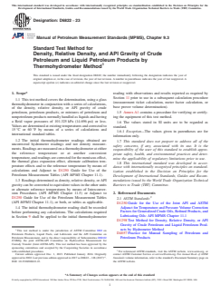 ASTM D6822-23 is a standard published by ASTM International. Its full title is "Standard Test Method for Density, Relative Density, and API Gravity of Crude Petroleum and Liquid Petroleum Products by Thermohydrometer Method". This standard covers: SIGNIFICANCE AND USE 5.1 Density and API gravity are used in custody transfer quantity calculations and to satisfy transportation, storage, and regulatory requirements. Accurate determination of density or API gravity of crude petroleum and liquid petroleum products is necessary for the conversion of measured volumes to volumes at the standard temperatures of 15 °C or 60 °F. 5.2 Density and API gravity are also factors that indicate the quality of crude petroleum. Crude petroleum prices are frequently posted against values in kg/m3 or in degrees API. However, this property of petroleum is an uncertain indication of its quality unless correlated with other properties. 5.3 Field of Application—Because the thermohydrometer incorporates both the hydrometer and thermometer in one device, it is more applicable in field operations for determining density or API gravity of crude petroleum and other liquid petroleum products. The procedure is convenient for gathering main trunk pipelines and other field applications where limited laboratory facilities are available. The thermohydrometer method may have limitations in some petroleum density determinations. When this is the case, other methods such as Test Method D1298 (API MPMS Chapter 9.1) may be used. 5.4 This procedure is suitable for determining the density, relative density, or API gravity of low viscosity, transparent or opaque liquids, or both. This procedure, when used for opaque liquids, requires the use of a meniscus correction (see 9.2). Additionally for both transparent and opaque fluids the readings shall be corrected for the thermal glass expansion effect and alternate calibration temperature effects before correcting to the reference temperature. This procedure can also be used for viscous liquids by allowing sufficient time for the thermohydrometer to reach temperature equilibrium. SCOPE 1.1 This test method covers the determination, using a glass thermohydrometer in conjunction with a series of calculations, of the density, relative density, or API gravity of crude petroleum, petroleum products, or mixtures of petroleum and nonpetroleum products normally handled as liquids and having a Reid vapor pressures of 101.325 kPa (14.696 psi) or less. Values are determined at existing temperatures and corrected to 15 °C or 60 °F by means of a series of calculations and international standard tables. 1.2 The initial thermohydrometer readings obtained are uncorrected hydrometer readings and not density measurements. Readings are measured on a thermohydrometer at either the reference temperature or at another convenient temperature, and readings are corrected for the meniscus effect, the thermal glass expansion effect, alternate calibration temperature effects and to the reference temperature by means of calculations and Adjunct to D1250 Guide for Use of the Petroleum Measurement Tables (API MPMS Chapter 11.1). 1.3 Readings determined as density, relative density, or API gravity can be converted to equivalent values in the other units or alternate reference temperatures by means of Interconversion Procedures (API MPMS Chapter 11.5) or Adjunct to D1250 Guide for Use of the Petroleum Measurement Tables (API MPMS Chapter 11.1), or both, or tables as applicable. 1.4 The initial thermohydrometer reading shall be recorded before performing any calculations. The calculations required in Section 9 shall be applied to the initial thermohydrometer reading with observations and results reported as required by Section 11 prior to use in a subsequent calculation procedure (measurement ticket calculation, meter factor calculation, or base prover volume determination). 1.5 Annex A1 contains a procedure for verifying or certifying the equipment of this test method. 1.6 The values stated in SI units are to be regarded as standard. 1.6.1 Exception—The values given in parentheses are for information only. 1.7 This standard does not purport to address all o...