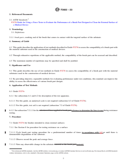 - Guide for Using a Force Tester to Evaluate the Performance of a Brush Part Designed to Clean the External Surface of a Medical Device. This is the referenced method upon which ASTM F3602-23 relies for force testing protocols and procedures.