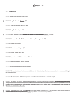 ASTM F3602-23 is a guide published by ASTM International. Its full title is "Standard Guide for Assessing the Compatibility of a Cleaning Brush Part with Different Substrates Used in the Construction of Medical Devices". This standard covers: SIGNIFICANCE AND USE 5.1 This guide describes the use of test methods in Guide F3276 to assess the compatibility of a brush part with the material substrates used in the construction of medical devices. 5.2 By providing objective, repeatable methods for evaluating performance under test conditions, this standard can improve the ability to assess the effectiveness of various brush part designs. SCOPE 1.1 This guide describes methods for assessing the compatibility, under prescribed laboratory conditions, of a cleaning brush part with substrate materials used in the construction of medical devices. The method utilizes a force tester to mechanically actuate a brush part at a constant rate. This action continues until there is any level of visible degradation, including but not limited to scratching or shaving of the substrate material. 1.2 The test methods utilized in this guide are those described in Guide F3276. In this guide, the number of repetitions is determined by the demonstrable degradation, if any, of the substrate, up to a specified maximum number of repetitions. 1.3 Brushes designed to clean medical devices after clinical use play an important role in the effective reprocessing of those medical devices. Instructions for use from the brush manufacturer should supply information related to the compatibility, or more importantly, incompatibility with materials that make up the composition of a medical device. This may be stated in terms of being suitable for specific materials, not suitable for specific materials, or suitable for a limited number of uses for specific materials. 1.4 Selecting the correct brush for the medical device to be cleaned is always a key factor to achieve effective cleaning. One of the significant factors when selecting a brush is selecting one that will not cause damage to the medical device, including the material the medical device is constructed of. Assessing if a brush part could damage a medical device because of the material the device is made of is an important step in determining the appropriate (and inappropriate) use of a brush. 1.5 Units—The values stated in SI units are to be regarded as the standard. No other units of measurement are included in this standard. 1.6 This standard does not purport to address all of the safety concerns, if any, associated with its use. It is the responsibility of the user of this standard to establish appropriate safety, health, and environmental practices and determine the applicability of regulatory limitations prior to use. 1.7 This international standard was developed in accordance with internationally recognized principles on standardization established in the Decision on Principles for the Development of International Standards, Guides and Recommendations issued by the World Trade Organization Technical Barriers to Trade (TBT) Committee.