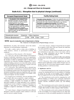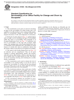 SIGNIFICANCE AND USE 4.1 Each Facility Rating Scale in this classification provides a means for estimating the level of serviceability of a building or facility for one topic of serviceability, and for comparing that level against the level of any other building or facility. 4.2 This classification can be used for comparing how well different buildings or facilities meet a particular requirement for serviceability. It is applicable despite differences such as location, structure, mechanical systems, age, and building shape. 4.3 This classification can be used to estimate the amount of variance of serviceability from target or from requirement for a single office facility or within a group of office facilities. 4.4 This classification can be used to estimate the following: (1) the serviceability of an existing facility for uses other than its present use; (2) the serviceability (potential) of a facility that has been planned but not yet built; and (3) the serviceability (potential) of a facility for which a remodelling has been planned. 4.5 The use of this classification does not result in building evaluation or diagnosis. Building evaluation or diagnosis generally requires special expertise in building engineering or technology and the use of instruments, tools, or measurements. 4.6 This classification applies only to facilities that are building constructions or parts thereof. (While this classification may be useful in rating the serviceability of facilities that are not building constructions, such facilities are outside the scope of this classification.) 4.7 This classification is not intended for, and is not suitable for, use for regulatory purposes, nor for fire hazard assessment or fire risk assessment. SCOPE 1.1 This classification covers pairs of scales for classifying an aspect of the serviceability of an office facility, that is, the capability of an office facility to meet certain possible requirements to accommodate changes in working method, and frequent relocations of staff, and realignment of workstations. 1.2 Each pair of scales shown in Figs. 1-5, printed side by side on a page, are for classifying one topic of serviceability within that aspect of serviceability. Each paragraph in an Occupant Requirement Scale (see Figs. 1-5) summarizes one level of serviceability on that topic that occupants might require. The matching entry in the Facility Rating Scale (see) is a translation of the requirement into a description of certain features of a facility that, taken in combination, indicate that the facility is likely to meet that level of required serviceability. FIG. 1 Scale A.6.1 for Disruption Due to Physical Change FIG. 1 Scale A.6.1 for Disruption Due to Physical Change (continued) FIG. 2 Scale A.6.2 for Illumination, HVAC, and Sprinklers FIG. 2 Scale A.6.2 for Illumination, HVAC, and Sprinklers (continued) FIG. 3 Scale A.6.3 for Minor Changes to Layout FIG. 3 Scale A.6.3 for Minor Changes to Layout (continued) FIG. 4 Scale A.6.4 for Partition Wall Relocations FIG. 4 Scale A.6.4 for Partition Wall Relocations (continued) FIG. 5 Scale A.6.5 for Lead Time for Facilities Group FIG. 5 Scale A.6.5 for Lead Time for Facilities Group (continued) 1.3 The entries in the Facility Rating Scale (see Figs. 1-5) are indicative and not comprehensive. They are for quick scanning, to estimate approximately, quickly, and economically how well an office facility is likely to meet the needs of one or another type of occupant group over time. The entries are not for measuring, knowing, and evaluating how an office facility is performing. 1.4 This classification can be used to estimate the level of serviceability of an existing facility. It can also be used to estimate the serviceability of a facility that has been planned but not yet built, such as one for which single-line drawings and outline specifications have been prepared. 1.5 This classification indi...