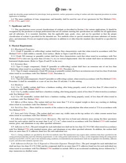 ABSTRACT This specification covers the properties of a cured single- or multicomponent cold-applied elastomeric joint sealant for sealing, caulking, or glazing operations on buildings, plazas, and decks for vehicular or pedestrian use, and types of construction other than highway and airfield pavements and bridges. A sealant qualifying under this specification shall be classified as to type, grade, class and use as follows: type S - a single-component sealant, type M - a multicomponent sealant, grade P - a pourable or selfleveling sealant, grade NS - a nonsag or gunnable sealant, class 100/50, class 50, class 35, class 25, class 12.5, use T, use NT, use I, use M, use G, use A, and use O. A single-component sealant shall be a uniform mixture of a consistency suitable for immediate application by hand or pressure caulking gun or by hand tool. A multicomponent chemically curing sealant shall be furnished in two or more components. A single-component and multicomponent sealant, when stored in the original unopened container at temperatures of not more than 27°C (80°F) shall be capable of meeting the requirements for at least 6 months after date of delivery. Grade P (pourable or selfleveling) sealant shall have the required flow characteristics, it shall exhibit a smooth, level surface. Grade NS or gunnable sealant shall have the required flow characteristics such that when tested in vertical displacement. Type S, grade P, and grade NS sealant shall not be less than the given extrusion rate when tested. Type M and grade P sealant, when tested shall be not less than the given extrudable rate 3 h after mixing. Use T (traffic) sealant shall have a hardness reading, after being properly cured, of not less than 25 or more than 50 when tested. Use NT (nontraffic) sealant shall have a hardness reading, after being properly cured, of not less than 15 or more than 50 when tested. The sealant shall not lose more than 7 % of its original weight or show any cracking or chalking when tested. There shall be no transfer of the sealant to the polyethylene film when tested at 72 h. The sealant shall not cause any visible stain on the top surface of a white cement mortar base when tested. The adhesion and cohesion after cyclic movement shall be tested to meet the requirements prescribed. The adhesion-in-peel test shall be performed to meet the requirements precribed. The adhesion-in-peel after ultraviolet exposure through glass shall be determined to meet the requirements prescribed. The accelerated weathering effects, and sealants exposed to continuous immersion shall be determined to meet the requirements prescribed. SIGNIFICANCE AND USE 7.1 This specification covers several classifications of sealants as described in Section 4 for various applications. It should be recognized by the purchaser or design professional that not all sealants meeting this specification are suitable for all applications and all substrates. It is essential, therefore, that the applicable type, grade, class, and use be specified so that the proper classification of sealant is provided for the intended use. Test methods relate to special standard specimen substrates of mortar, glass, and aluminum. If tests are required using substrates in addition to or other than the standard, they should be so specified for testing. SCOPE 1.1 This ASTM specification covers the properties of a cured single- or multicomponent cold-applied elastomeric joint sealant for sealing, caulking, or glazing operations on buildings, plazas, and decks for vehicular or pedestrian use, and types of construction other than highway and airfield pavements and bridges. 1.2 A sealant meeting the requirements of this specification shall be designated by the manufacturer to be one or more of the types, classes, grades, and uses defined in Section 7. 1.3 The values stated in SI units are to be regarded as the standard. The values given in parentheses are for information only. 1.4 Thi...