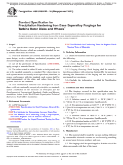 ASTM A891/A891M-16(2021) - Standard Specification for Precipitation Hardening Iron Base Superalloy Forgings for Turbine Rotor Disks and Wheels sets out requirements for the manufacture and testing of precipitation hardened iron base superalloy forgings. These forgings are primarily intended for use in turbine rotor disks and wheels, which demand excellent mechanical properties and high performance at elevated temperatures. Developed by ASTM International, this standard supports consistent quality and safety in high-stress, high-temperature applications within power generation and aerospace sectors.