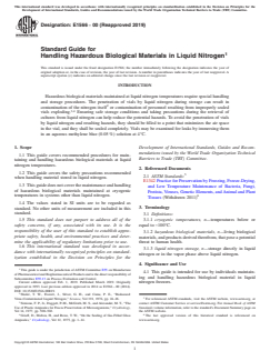 SIGNIFICANCE AND USE 4.1 This guide is intended for use by individuals maintaining and handling hazardous biological material in liquid nitrogen freezers. 4.2 This guide does not cover all aspects of every situation that may be encountered in maintaining hazardous biological material in liquid nitrogen; each situation must therefore be assessed individually using these guidelines. 4.3 This guide is not intended for use with systems other than liquid nitrogen storage. 4.4 This guide does not cover practices for preservation by freezing which are covered in Practice E1342. SCOPE 1.1 This guide covers recommended procedures for maintaining and handling hazardous biological materials at liquid nitrogen temperatures. 1.2 This guide covers the safety precautions recommended when handling material stored in liquid nitrogen. 1.3 This guide does not cover the maintenance and handling of hazardous biological materials maintained at cryogenic temperatures in systems other than liquid nitrogen. 1.4 The values stated in SI units are to be regarded as standard. No other units of measurement are included in this standard. 1.5 This standard does not purport to address all of the safety concerns, if any, associated with its use. It is the responsibility of the user of this standard to establish appropriate safety, health, and environmental practices and determine the applicability of regulatory limitations prior to use. 1.6 This international standard was developed in accordance with internationally recognized principles on standardization established in the Decision on Principles for the Development of International Standards, Guides and Recommendations issued by the World Trade Organization Technical Barriers to Trade (TBT) Committee.