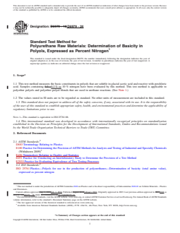 ASTM D6979-24 is a standard published by ASTM International. Its full title is "Standard Test Method for Polyurethane Raw Materials: Determination of Basicity in Polyols, Expressed as Percent Nitrogen". This standard covers: SIGNIFICANCE AND USE 5.1 This test method is suitable for quality control, as a specification test, and for research. The results are measures of batch-to-batch uniformity and are useful in estimating reactivity. 5.1.1 The percent nitrogen can be used to characterize a polyol or indicate amounts of certain components in a polyol blend. 5.1.2 It is permissible to also express the results in equivalents of base per gram of sample, if desired. SCOPE 1.1 This test method measures the basic constituents in polyols that are soluble in glacial acetic acid and reactive with perchloric acid. Samples containing 0.3 % to 10 % nitrogen have been evaluated by this method. This test method is applicable to polyether polyols and polyether polyol blends that are used in urethane reactions. (See Note 1.) 1.2 The values stated in SI units are to be regarded as standard. No other units of measurement are included in this standard. 1.3 This standard does not purport to address all of the safety concerns, if any, associated with its use. It is the responsibility of the user of this standard to establish appropriate safety, health, and environmental practices and determine the applicability of regulatory limitations prior to use. Note 1: This standard is equivalent to ISO 25761:08. 1.4 This international standard was developed in accordance with internationally recognized principles on standardization established in the Decision on Principles for the Development of International Standards, Guides and Recommendations issued by the World Trade Organization Technical Barriers to Trade (TBT) Committee.
